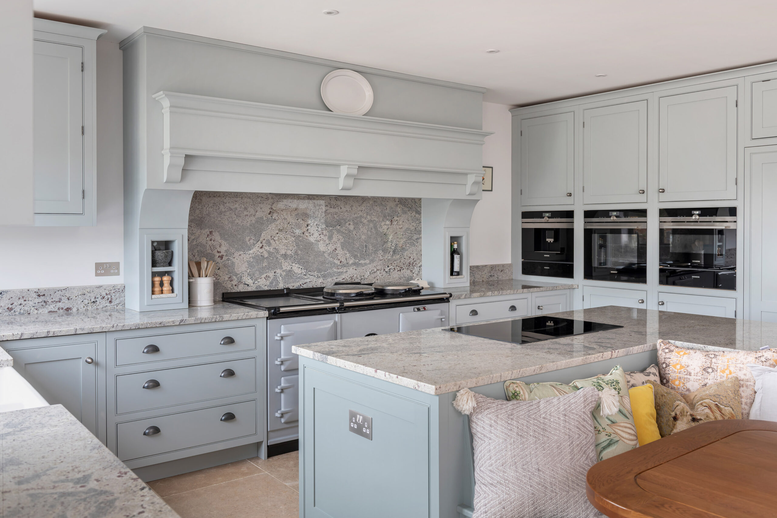 They wanted a natural material for the worktops and chose Kashmir White Granite to give the kitchen a dramatic look which works beautifully with the cabinets painted in Zoffany La Seine for the outer units and Aubusson for the island.