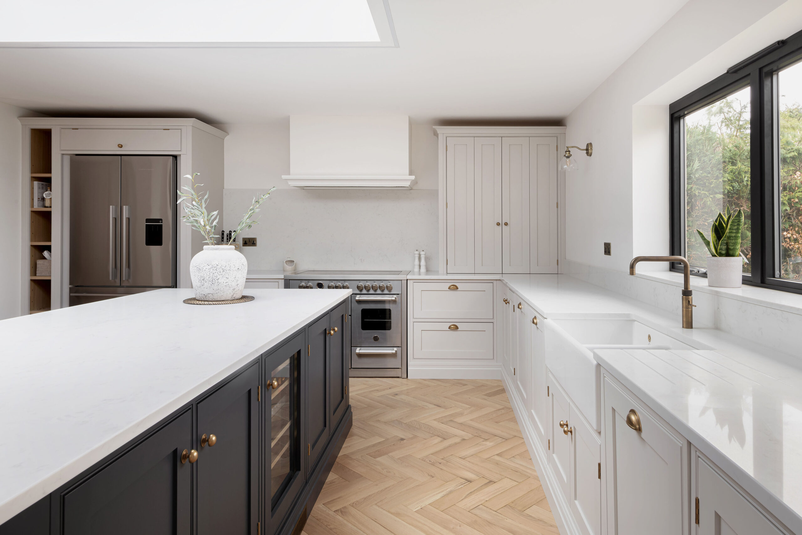 The kitchen is a light open space with flexible base cabinet storage hand painted in Zoffany Half Silver. The range cooker has deep drawers at either side with solid oak cutlery and utensil inserts whilst above is a modern canopy with flush fitting extractor.
