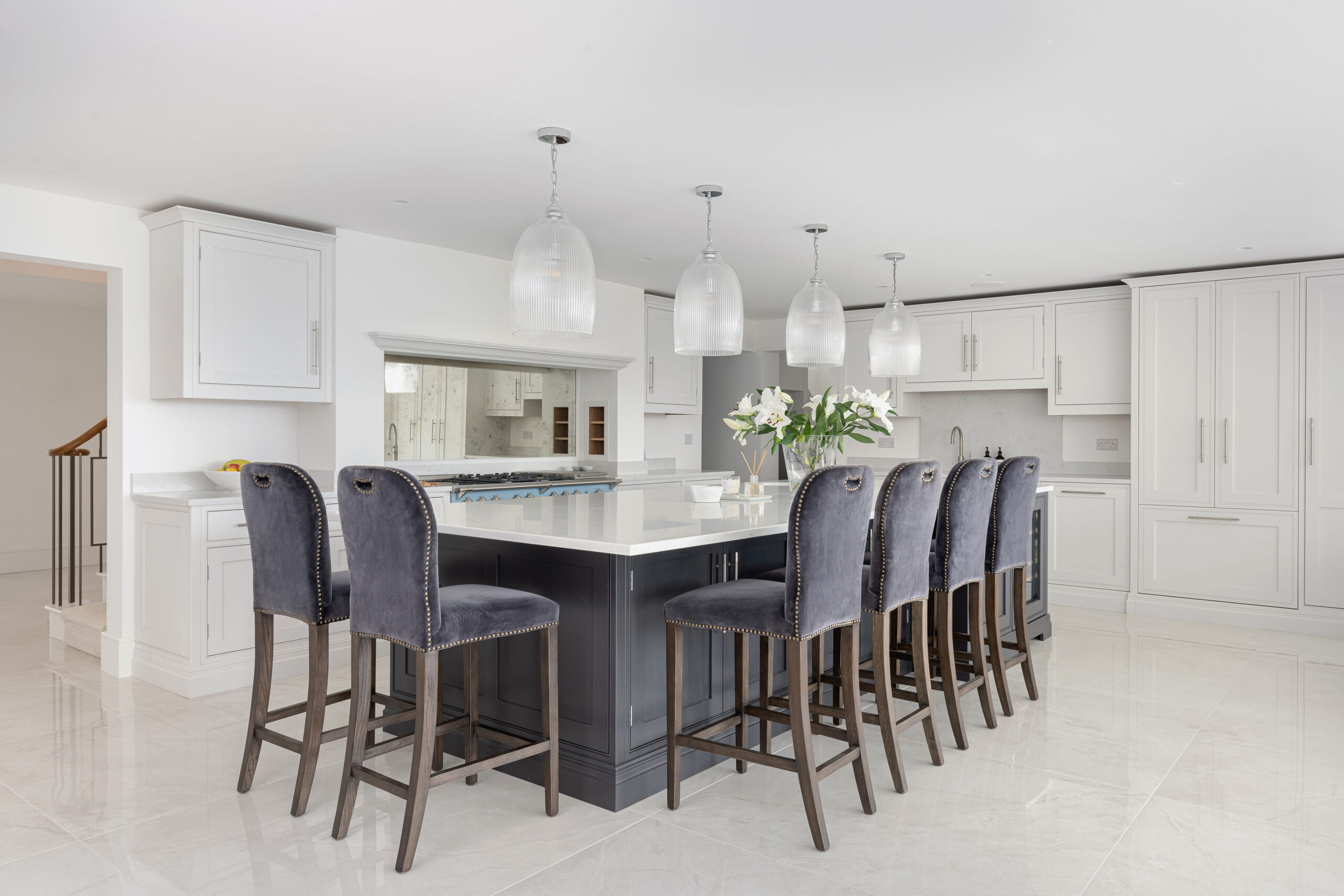 When extending a property you have a clean slate to work with. Our clients wanted a classic kitchen with a modern feel to sit in the heart of this new rear extension. Overlooking acres of fields it was important to keep the kitchen light and airy whilst retaining a welcoming feeling. Contrasting colours by Zoffany created a little drama with Bone Black on the island and whilst the outer cabinets remain calm in the colour Snow. Satin Nickel bar handles on simple clean fronted drawers gives an elegant clean look to a traditional cockbead Shaker style kitchen that seamlessly brings the whole look together.
